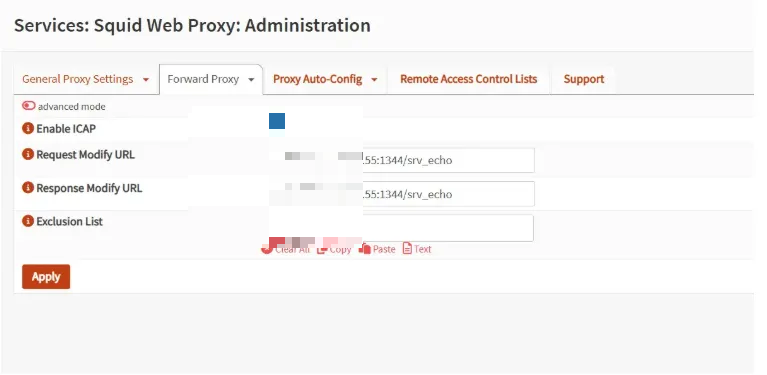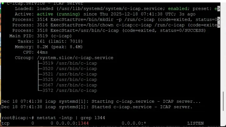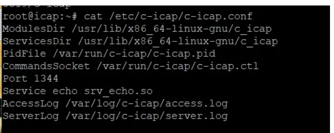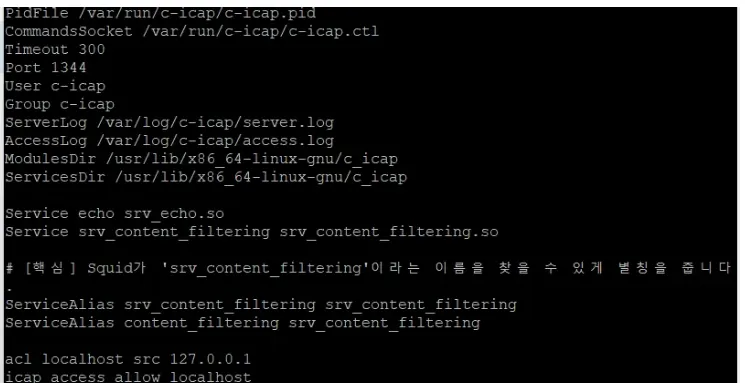- 스퀴드 프록시가 이를 가로채 설정된 icap_service 규칙에 따라 수신된 데이터를 가공하지 않고 즉시 1344번 포트의 C-ICAP 서버로 전달하여 내용 검사한다.