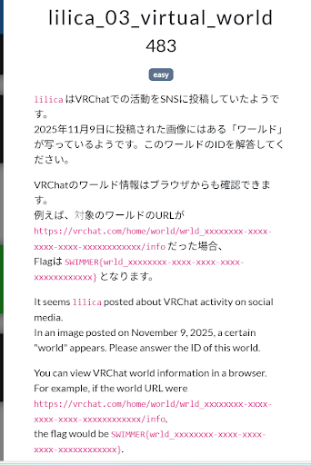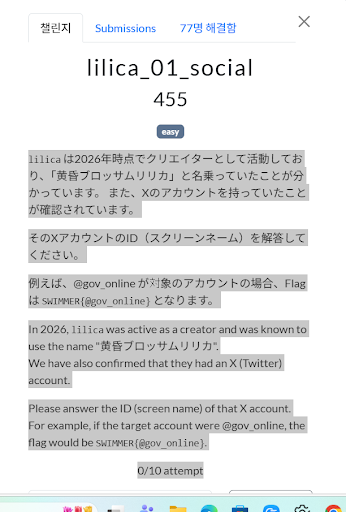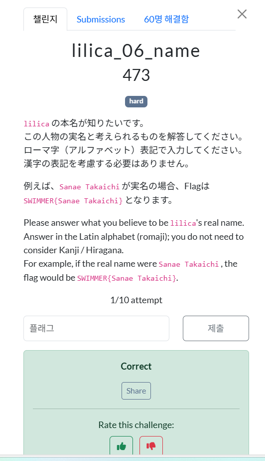 새로운 문제로 넘어왔군요! 이번에는 lilica의 본명을 찾는 'hard' 난이도의 미션이다. 로마자(알파벳) 표기로 입력해야 하며, SWIMMER{Firstname Lastname} 형식이 될 것 같다
